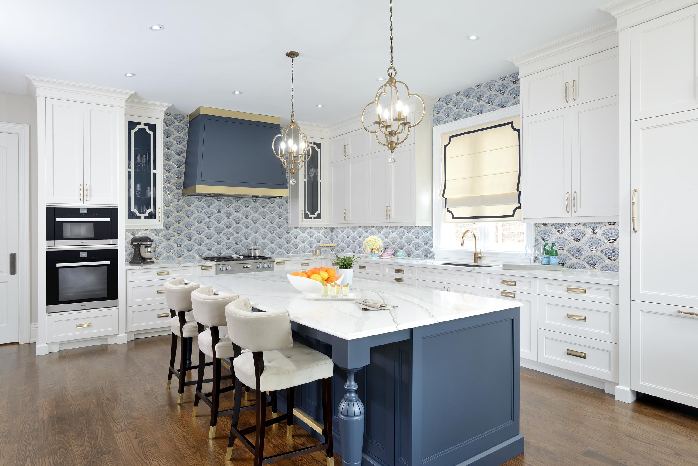 For this Toronto kitchen cabinet project, the classic Shaker style was chosen to bring a timeless yet contemporary feel to the space. The cabinets were painted in a sophisticated combination of Benjamin Moore’s Chantilly Lace, a crisp and clean white, and Benjamin Moore’s Old Navy, a rich, deep blue.