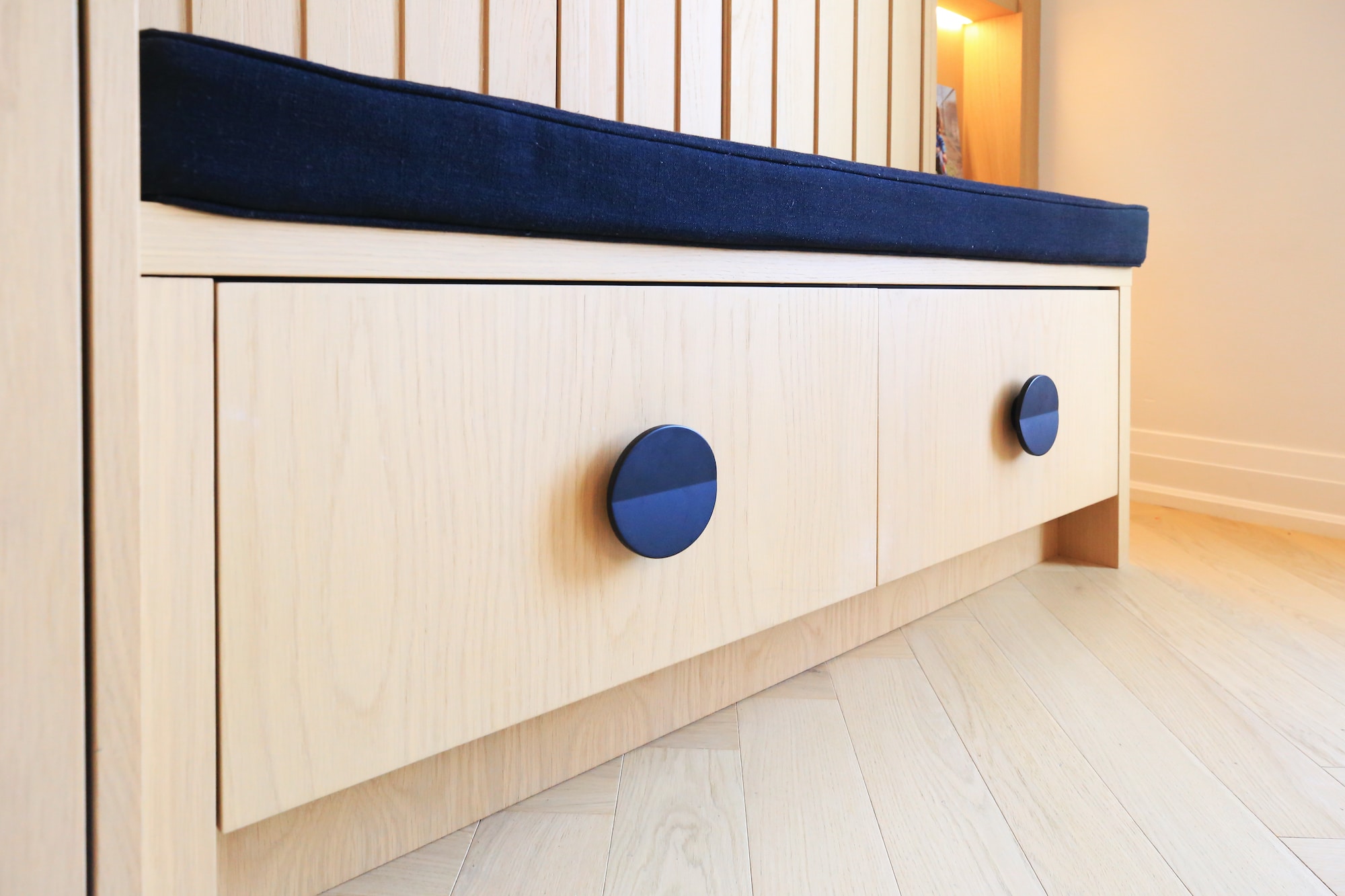The handles are sleek and subtle, with the Syma 2 Inglete handle almost disappearing into the cabinets, leaving just a touch of metal at the top of the doors. We also added Richelieu Modern Metal Knobs in brushed nickel for a modern touch.