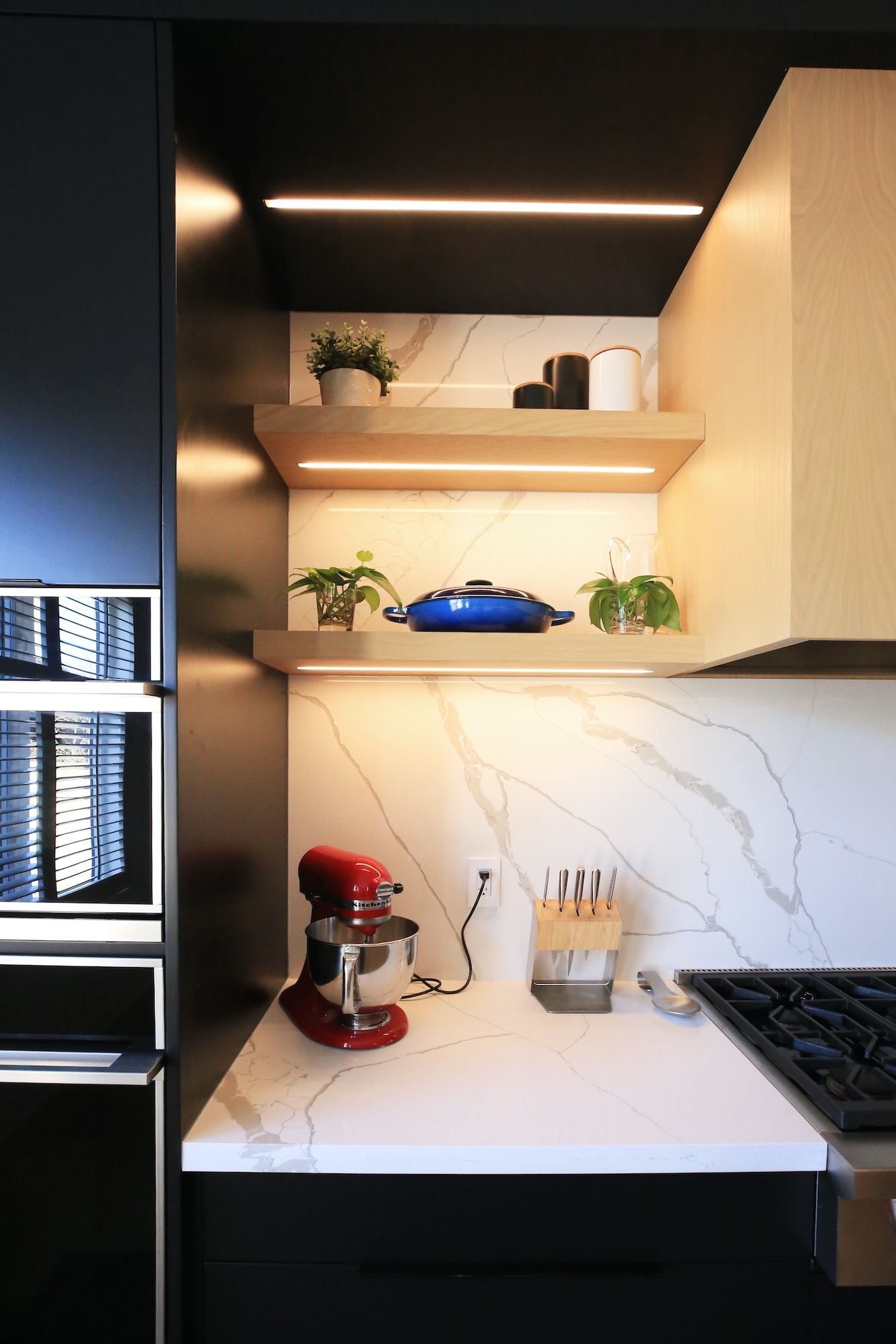 The client wanted a very clean, open look with minimal upper cabinets, so we included niche spaces for cooking spices, small floating shelves near the stove for décor and more spices, and open storage above the laundry machines. One unique feature of this kitchen is the slide-out butcher block countertop above the laundry area, perfect for extra workspace.